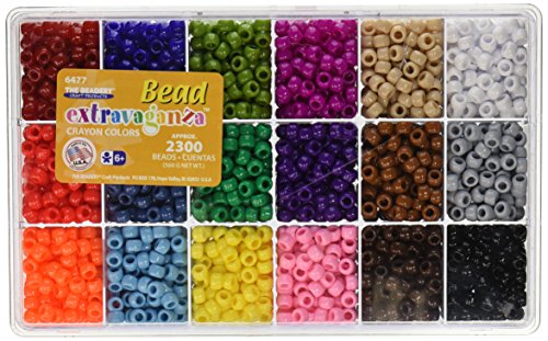 BEADERY-Bead Extravaganza Box: Crayon Mix. This package contains approximately 2300 plastic pony beads in eighteen opaque colors. Each measures 1/4x1/4 inch. Recommended for ages 6 and up. Made in USA.