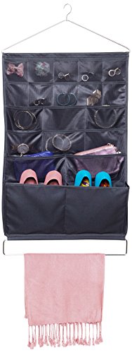 A double-sided hanging jewellery and accessories organizer with 18 small mesh pockets on each side, 3D pockets for bulkier items and a steel rail for scarves, belts and other accessories. Details: , Integrated Handle , Can be stored in the wardrobe or hung on a peg , 18 small mesh pockets on each side , 2 x 3D Bags , Find everything quickly and easily , High-quality workmanship , Designer: Tracy Wong / Sung Wook Park Dimensions: Height: 88.9 cm Length: 45.1 cm Width: 14 cm Colour: Carbon Material: Polyester / Steel Manufacturer Article Number: 294220149 Picture only for preview purposes. Decorations not included in delivery. , Pack contains:1 Umbra Closet Bestow Organiser, Jewellery Case, Jewellery Organiser, Jewellery Box, Jewellery, Accessories, Both Sides Usable, 36 Mesh Pockets, Polyester / Steel, Carbon, 294220149